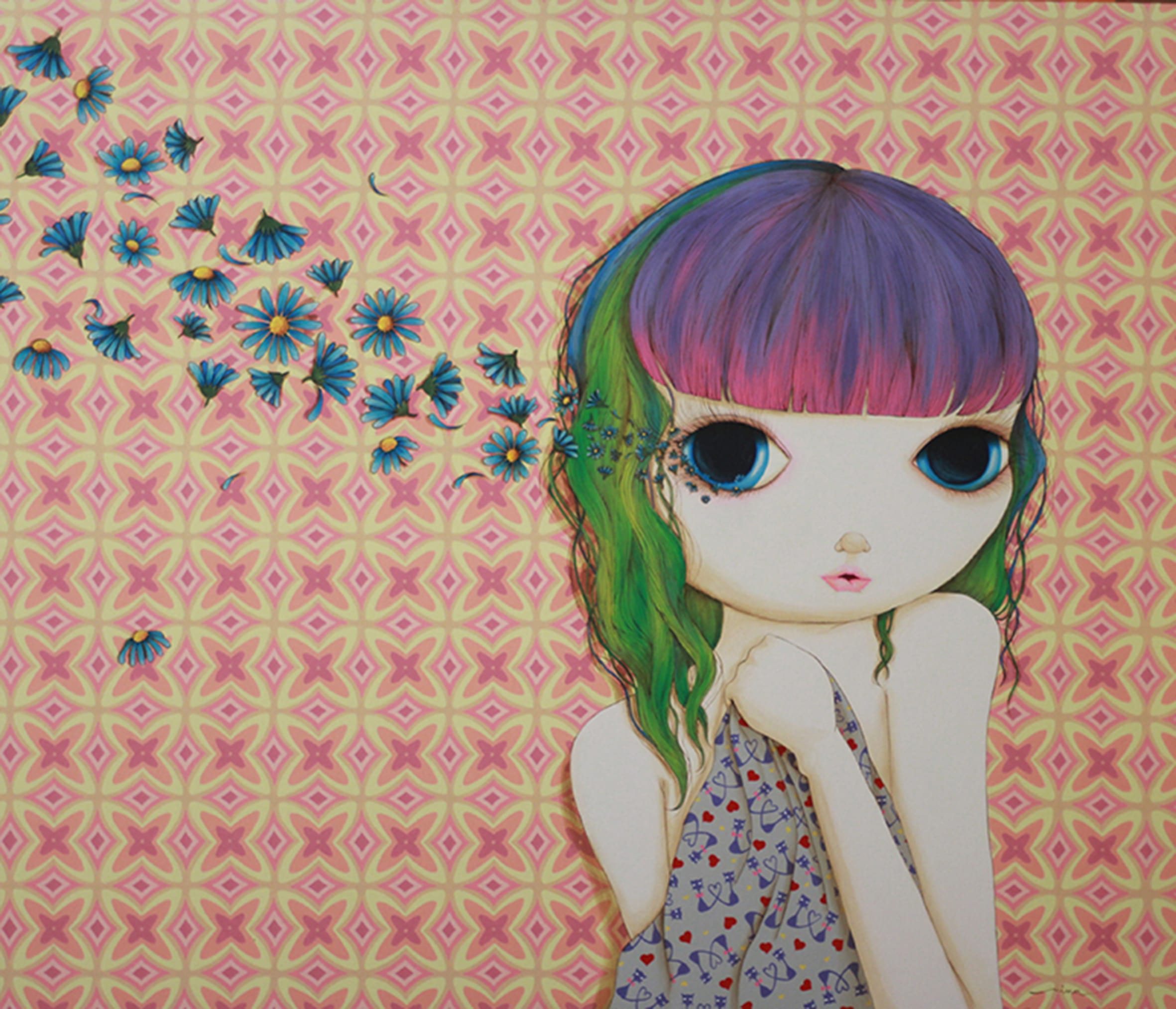 "Nina Pandolfo ficou conhecida por criar um universo lúdico e bem particular, pintando delicadas meninas de olhos grandes e expressivos, que misturam uma dose de ingenuidade com a delicadeza feminina e um toque de sensualidade.